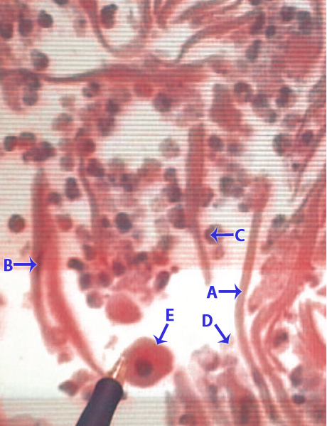 | A | Dead elongated cells with no nuclei | Keratotic skin cells | Dead cardiomyocytes (striations lost) | Dead hyphae/ pseudohyphae |